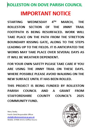 Important Notice about Jinny Nature Trail Footpath resurfacing work which starts Wednesday 4th March