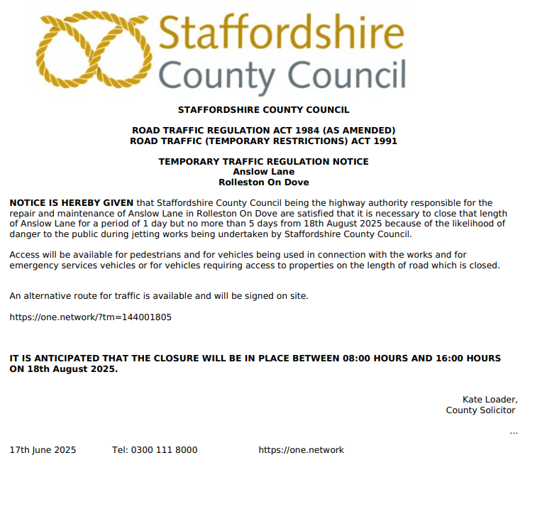 Temporary Traffic Notice Order for road closure of Anslow Lane Rolleston on Dove 18th August 2025